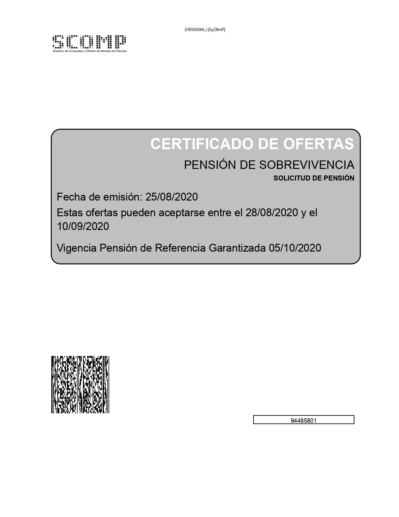 Esta es la primera página del certificado de ofertas. En ella encontrarás información como el tipo de pensión, la fecha de emisión y el período en que las ofertas se encuentran vigentes. |