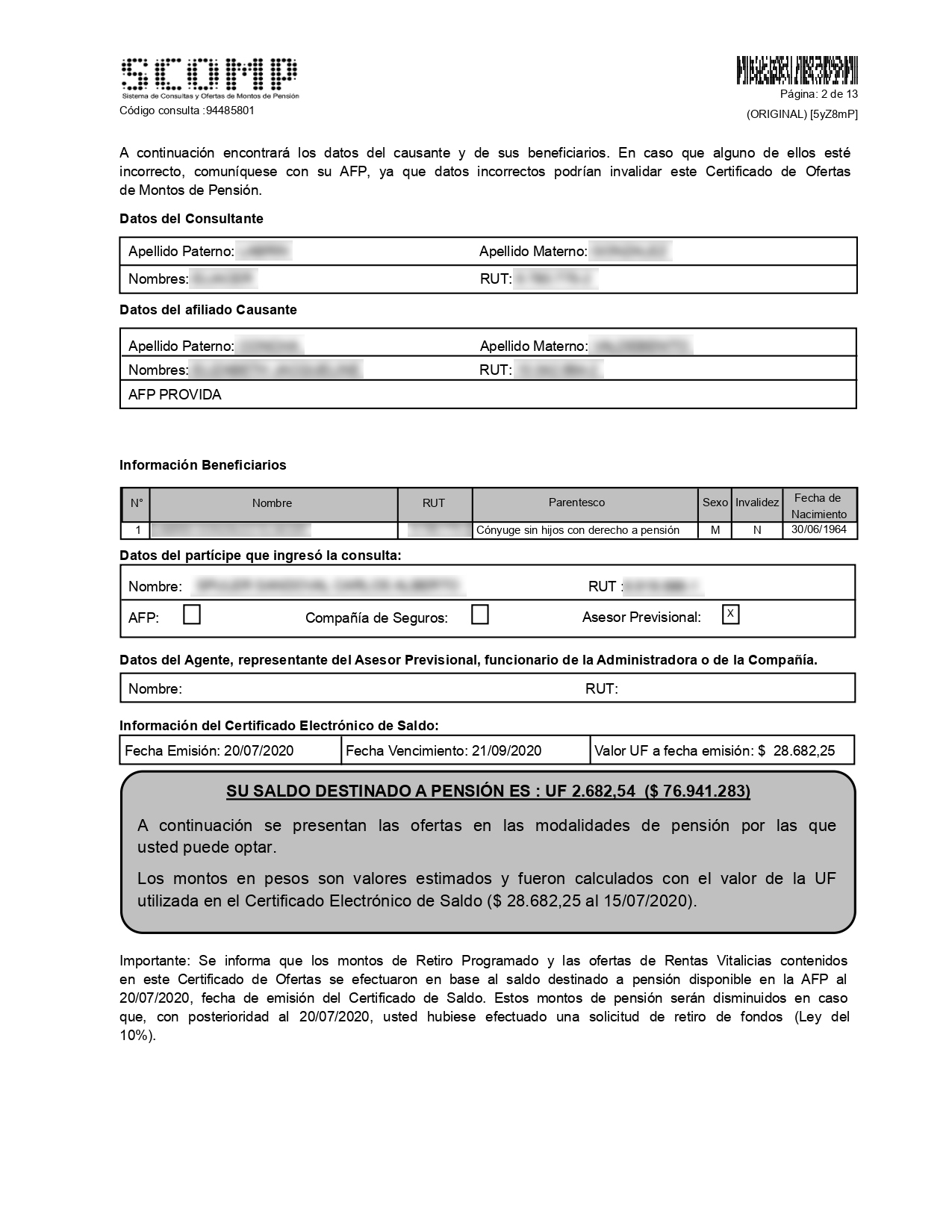 En esta sección del Certificado encontrarás información del Afiliado, de los Beneficiarios declarados al momento de hacer la Solicitud de Pensión y del participe que ingresó tu Solicitud de Ofertas. También encontrarás datos relevantes del Certificado de Saldo y el saldo destinado a pensión. |