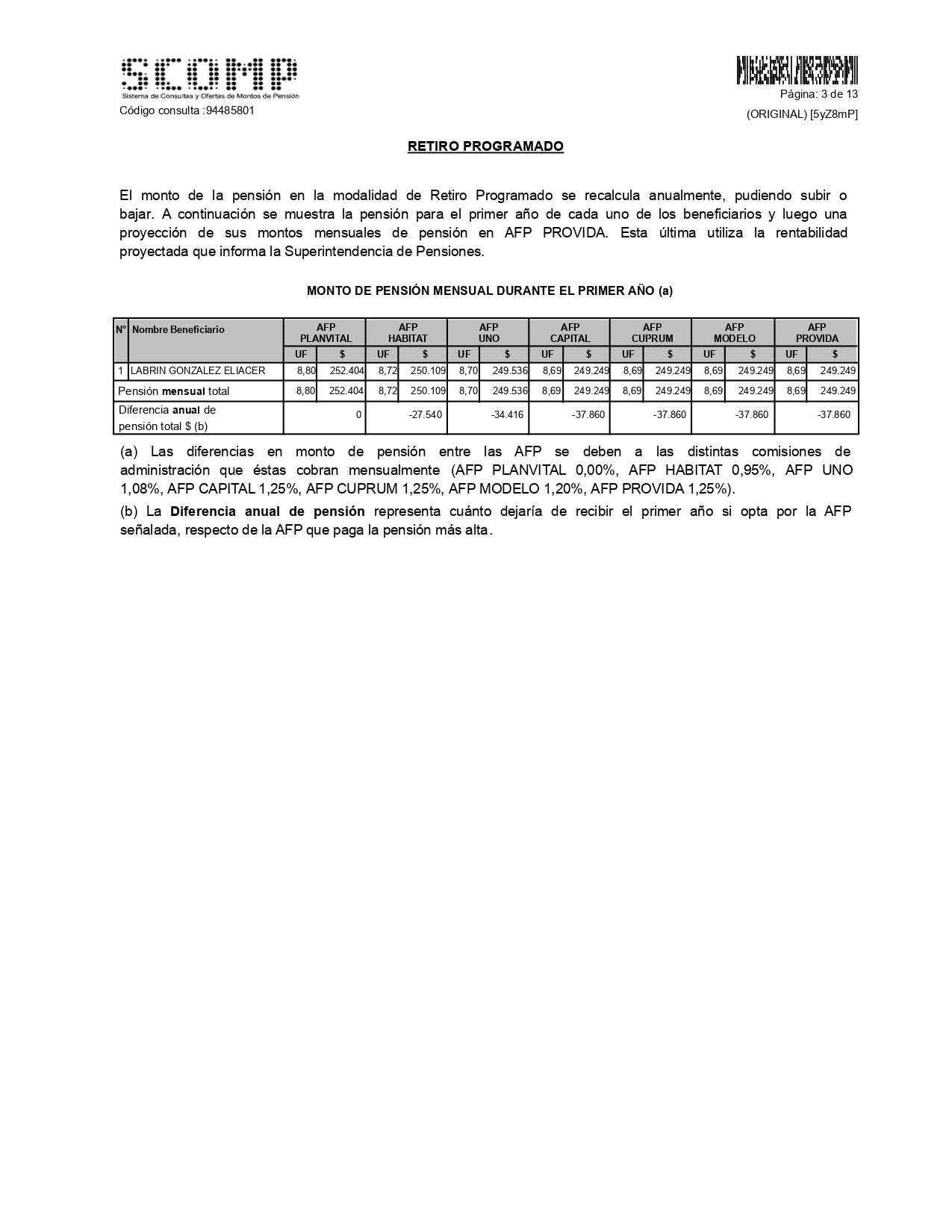 En esta sección podrás encontrar el monto de pensión que ofertan las AFP en la modalidad de pensión Retiro Programado, calculadas a la fecha de emisión de tu Certificado de Saldo. Además, podrás observar la proyección del monto mensual de pensión que entregará la AFP a medida que vayan pasando los años, asumiendo que los parámetros al momento del cálculo se mantengan en el tiempo. Si cuentas con derecho a excedente de libre disposición y solicitaste excedente en tu consulta, podrás ver los montos que puedes recibir por este concepto. |