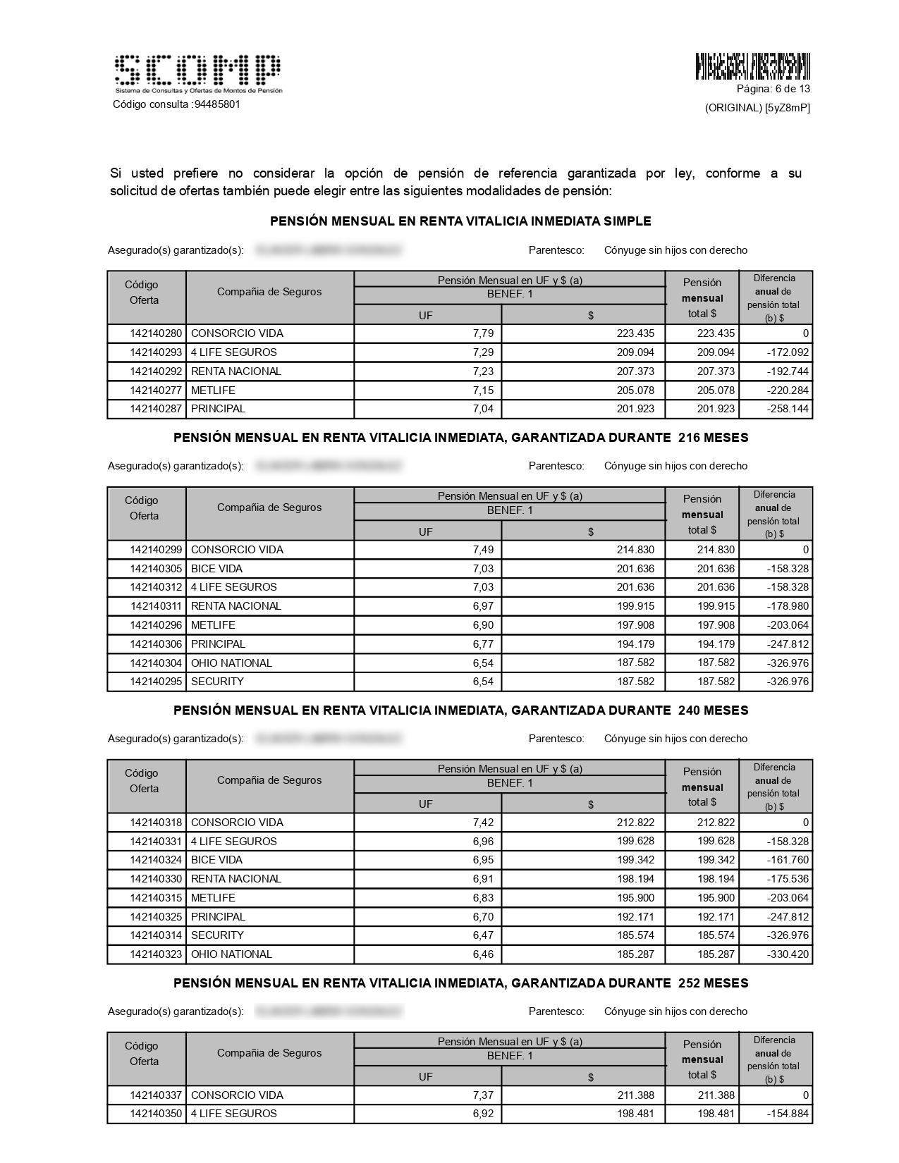 En esta sección encontrarás las ofertas de renta vitalicia efectuadas por las compañías de seguros de vida, conforme a lo que solicitaste en la Solicitud de Ofertas. Las ofertas se presentan clasificadas por Modalidad de Pensión, en el siguiente orden: 1. Renta Vitalicia Inmediata2. Renta Temporal con Renta Vitalicia Diferida3. Renta Vitalicia Inmediata con Retiro ProgramadoA su vez, en cada una de estas modalidades de pensión, las ofertas se presentan en diferentes cuadros de ofertas, conforme a las condiciones especiales de cobertura solicitadas por ti en la Solicitud de Ofertas y/o si dichas ofertas incluyen o no algún tipo de excedente de libre disposición. Dentro de cada uno de estos cuadros, las ofertas se presentan en forma descendente por monto de pensión, es decir, en el primer lugar aparece la oferta de pensión de la compañía que presenta el monto de pensión más alto para esa modalidad de pensión y condiciones de cobertura señaladas en cada cuadro. En caso de igualdad de monto entre más de una compañía de seguros, se presenta en primer lugar la compañía que tiene la mejor clasificación de riesgo. Dicha clasificación se presenta en la sección “Clasificación de Riesgo Compañías de Seguros de Vida”, al final del Certificado de Ofertas. |