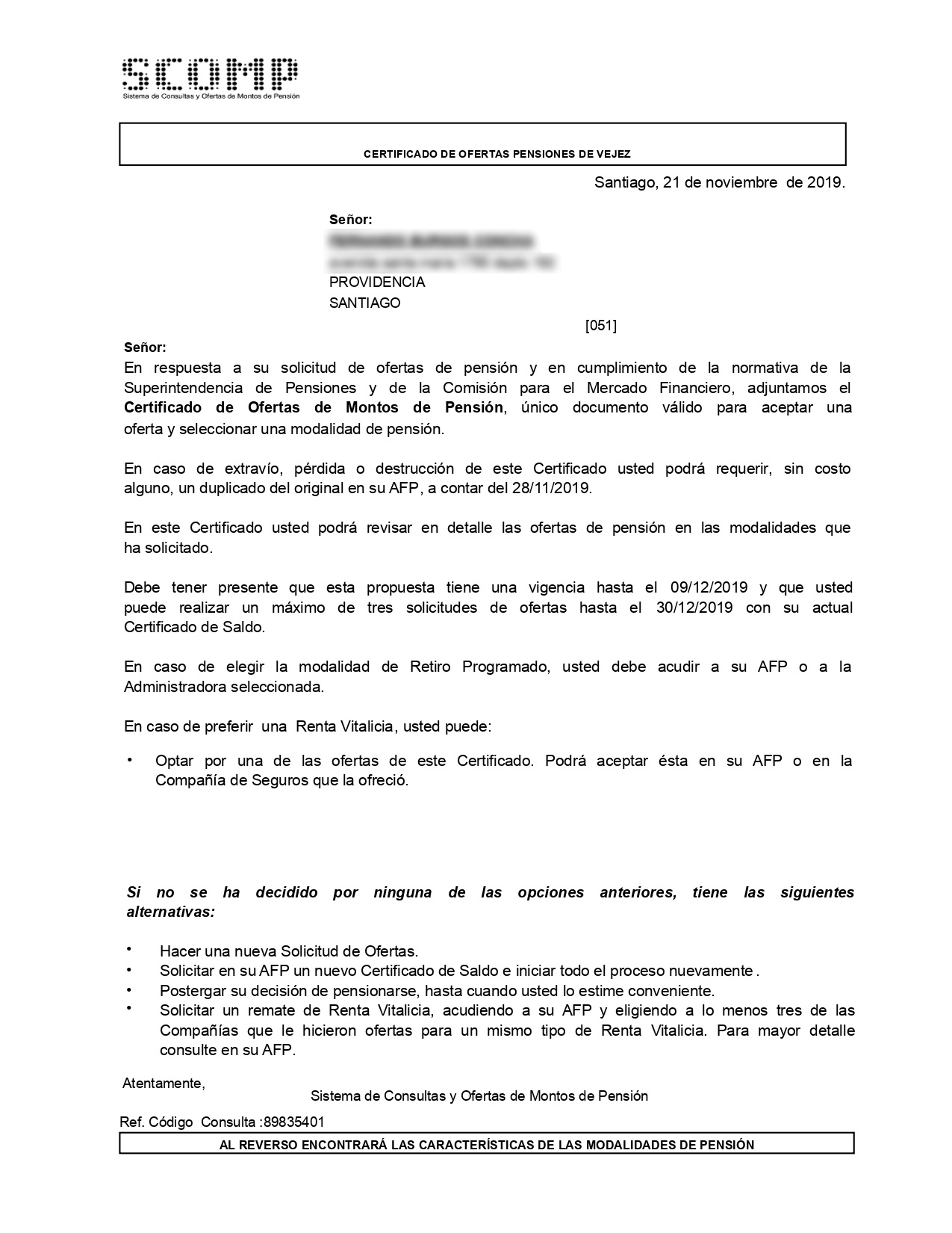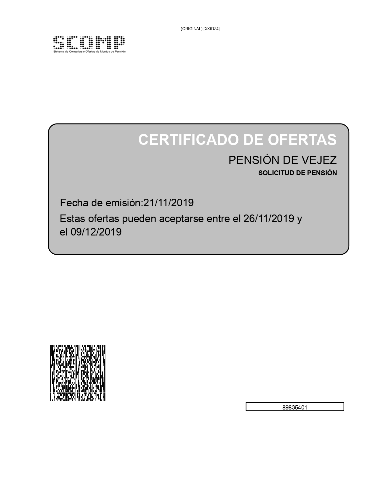 Esta es la primera página del certificado de ofertas. En ella encontrarás información como el tipo de pensión, la fecha de emisión y el período en que las ofertas se encuentran vigentes. |