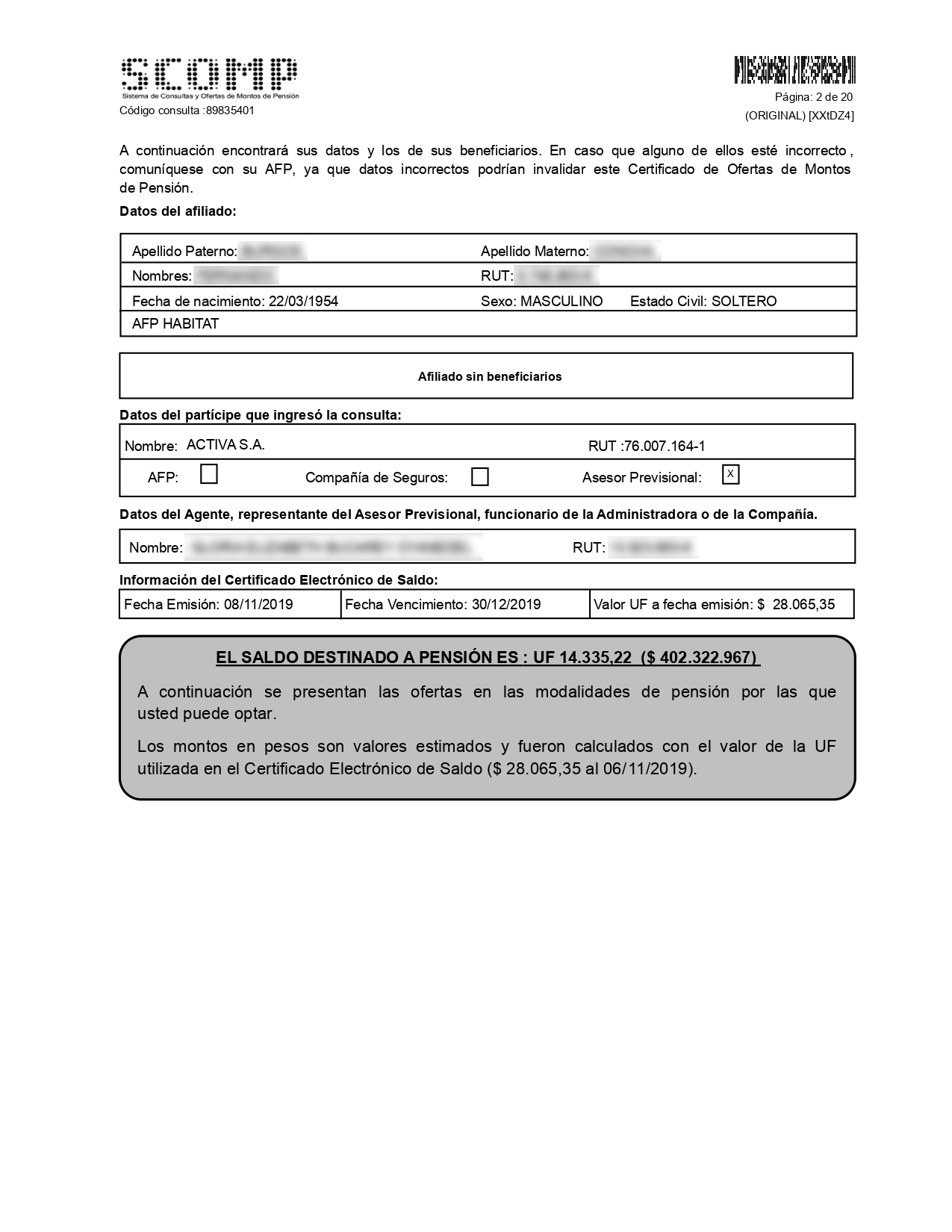 En esta sección del Certificado encontrarás información del Afiliado, de los Beneficiarios declarados al momento de hacer la Solicitud de Pensión y del participe que ingresó tu Solicitud de Ofertas. También encontrarás datos relevantes del Certificado de Saldo y el saldo destinado a pensión. |