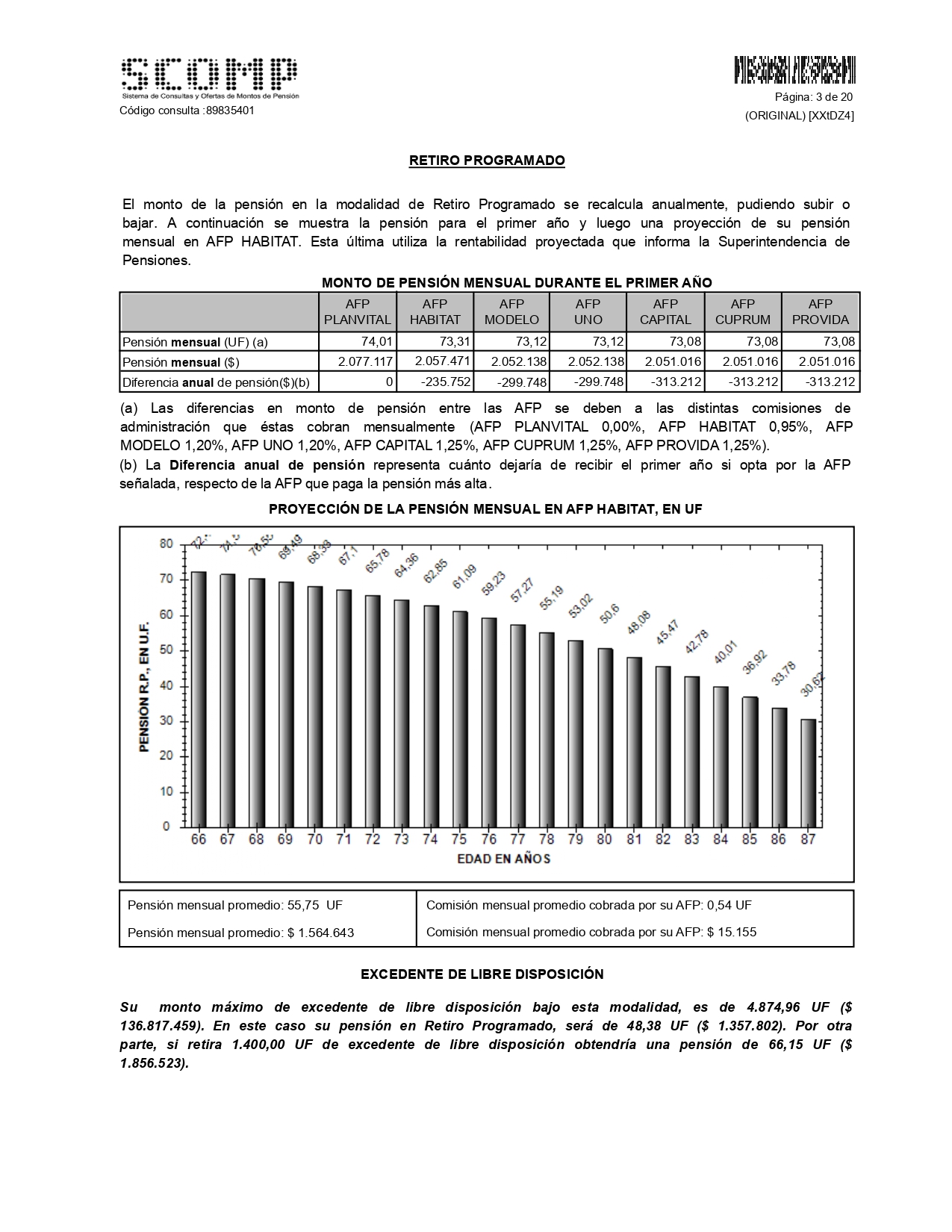En esta sección podrás encontrar el monto de pensión que ofertan las AFP en la modalidad de pensión Retiro Programado, calculadas a la fecha de emisión de tu Certificado de Saldo. Además, podrás observar la proyección del monto mensual de pensión que entregará la AFP a medida que vayan pasando los años, asumiendo que los parámetros al momento del cálculo se mantengan en el tiempo. Si cuentas con derecho a excedente de libre disposición y solicitaste excedente en tu consulta, podrás ver los montos que puedes recibir por este concepto. |