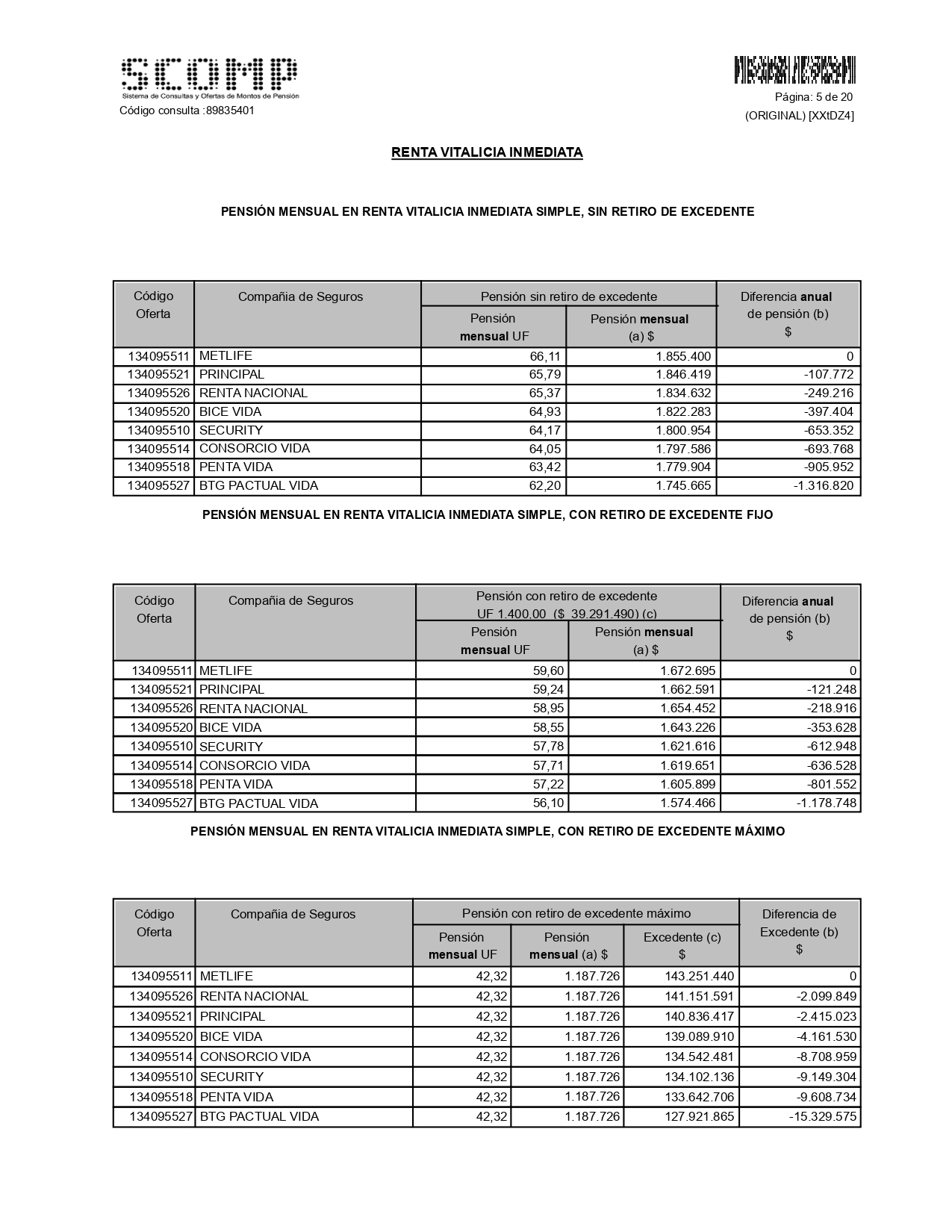En esta sección encontrarás las ofertas de renta vitalicia efectuadas por las compañías de seguros de vida, conforme a lo que solicitaste en la Solicitud de Ofertas. Las ofertas se presentan clasificadas por Modalidad de Pensión, en el siguiente orden: 1. Renta Vitalicia Inmediata2. Renta Temporal con Renta Vitalicia Diferida3. Renta Vitalicia Inmediata con Retiro ProgramadoA su vez, en cada una de estas modalidades de pensión, las ofertas se presentan en diferentes cuadros de ofertas, conforme a las condiciones especiales de cobertura solicitadas por ti en la Solicitud de Ofertas y/o si dichas ofertas incluyen o no algún tipo de excedente de libre disposición. Dentro de cada uno de estos cuadros, las ofertas se presentan en forma descendente por monto de pensión, es decir, en el primer lugar aparece la oferta de pensión de la compañía que presenta el monto de pensión más alto para esa modalidad de pensión y condiciones de cobertura señaladas en cada cuadro. En caso de igualdad de monto entre más de una compañía de seguros, se presenta en primer lugar la compañía que tiene la mejor clasificación de riesgo. Dicha clasificación se presenta en la sección “Clasificación de Riesgo Compañías de Seguros de Vida”, al final del Certificado de Ofertas. |